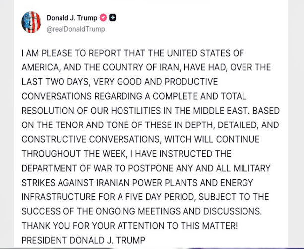 According to our source, Trump expressed “happiness” in announcing that the last two days had seen “highly positive and productive” talks aimed at a final and definitive resolution to the Middle Eastern crisis. As a gesture of goodwill, the US Department of War has been ordered to postpone all military strikes against Iranian energy and power infrastructure for a period of five days.